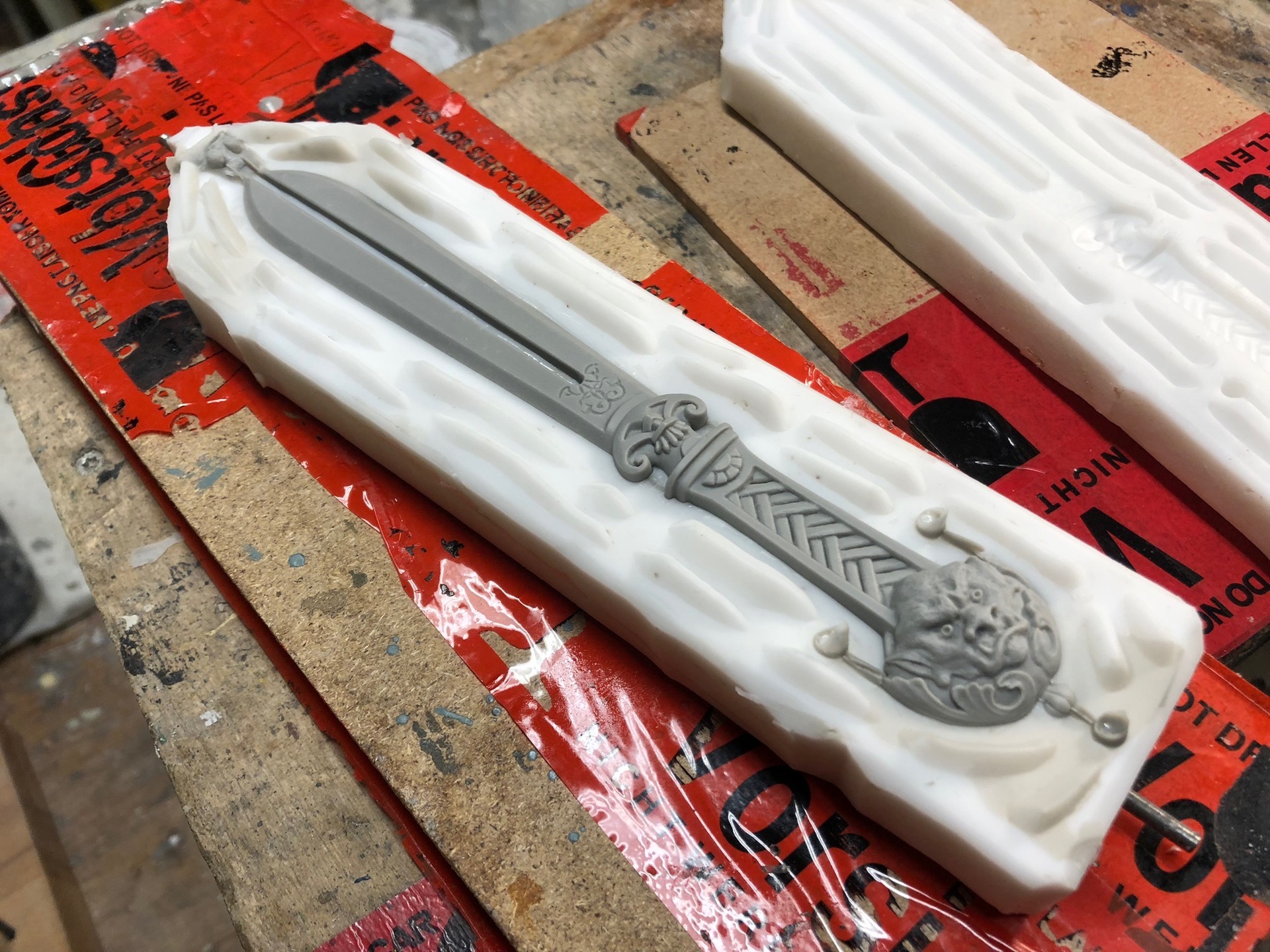 Das finale Schwert in der Gussform, frisch gegossen.