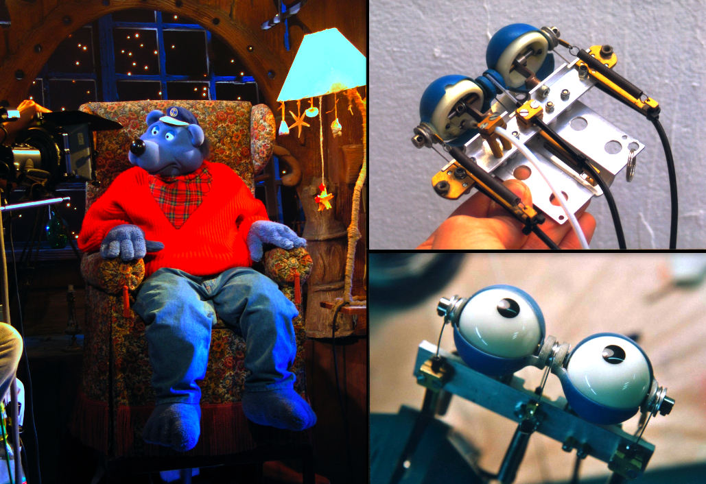Im Bild mal die Augenmechanik für KÄPT´N BLAUBÄR; eine Version der Mechanik, die es nur genau einmal gab: Mechanik mit Doppellid-plus Unterlid-Funktion.